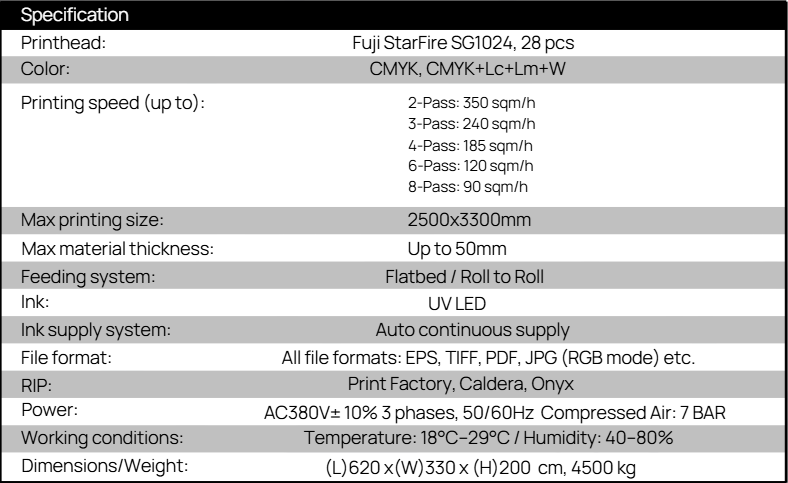 The JetBox 2530 is a high-speed hybrid UV printer designed for both flatbed and roll-to-roll production, offering seamless switching between flexible and rigid materials.