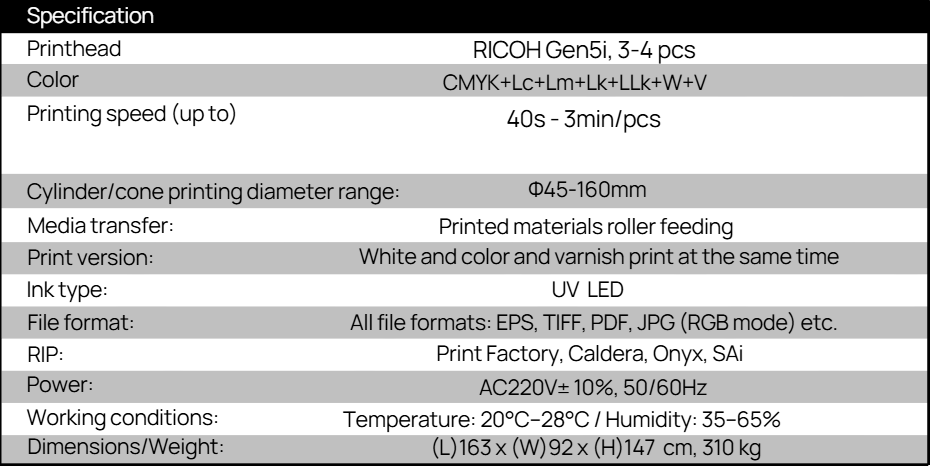 • Obsługuje warstwy CMYK, biały i lakier, umożliwiając premium wykończenia dla pełnokolorowych, spot-białych oraz ochronnych aplikacji