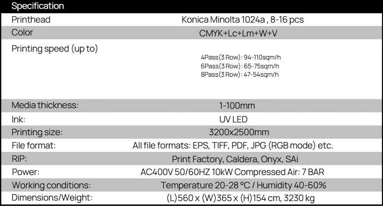 - Przyjazne dla użytkownika sterowanie i precyzyjna konstrukcja mechaniczna czynią FB3225 idealnym do druku reklam, dekoracji, opakowań oraz zastosowań przemysłowych