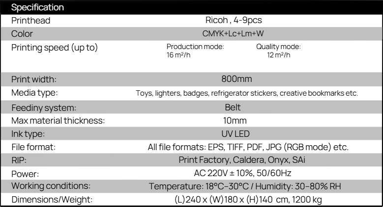 Przeznaczony do małych i nieregularnych przedmiotów, takich jak zabawki, zapalniczki, przypinki i akcesoria promocyjne, MR-880UV zapewnia szybki, dokładny i niezawodny druk UV